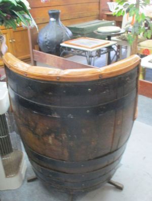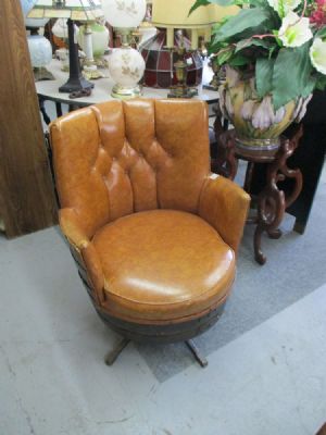 Vintage barrel chairA 'back in the day' barrel chair upholstered in brown naugahyde that still rocks and swivels. At 27" wide and 32" tall, a comfortable and unique piece to complement to any vintage decor! $95.00