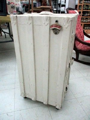 This clever transformation of a vintage trunk turned into a bar cart includes shelving, a wine rack and bottle opener on the front. Painted in a neutral beige, this flea flip can serve as a side table when not hosting guests. $75.00